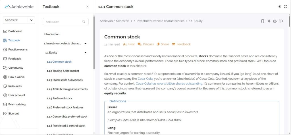 I really enjoyed Achievable. It’s a budget-friendly, tech-forward Series 66 prep course rooted in cognitive science. It’s also a student favorite. With a reported 95% pass rate, tens of millions of practice questions answered, and more than 2 million study hours logged by users, this course clearly resonates with self-driven learners looking to study smart and pass with flying colors.