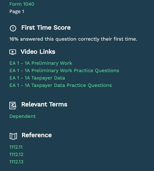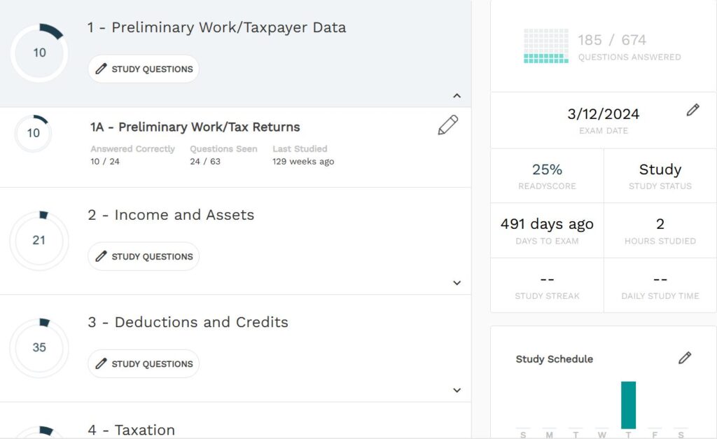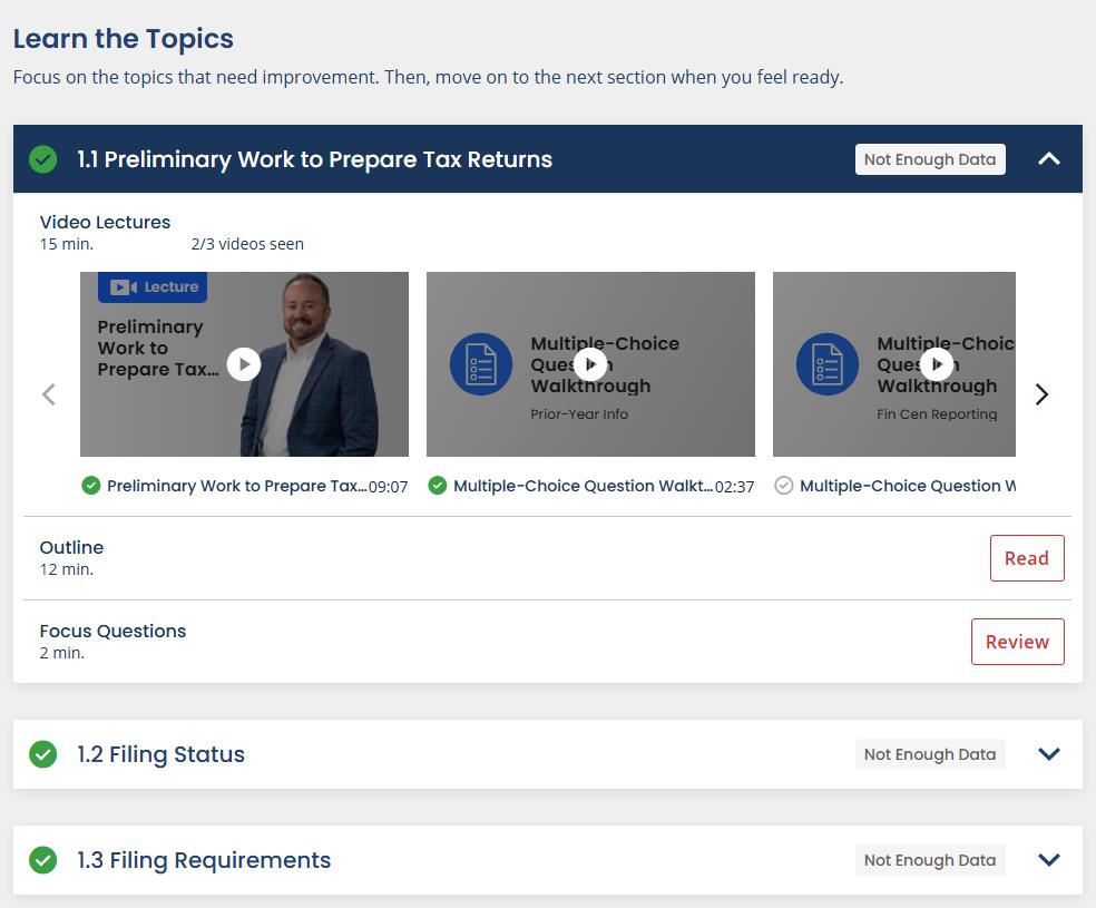 Gleim’s content structure immediately stood out to me because of how clean and logical it felt. Each unit starts with a diagnostic quiz, then breaks into digestible topic sections—each with a short intro video, two walk-through videos, a written outline, and a set of focus questions. It helped me move through the material in a way that didn’t feel overwhelming. Their 3,800+ practice questions (including some sourced directly from the IRS) also felt exam-relevant and well-written, and SmartAdapt helped me zero in on weak spots with less guesswork.
