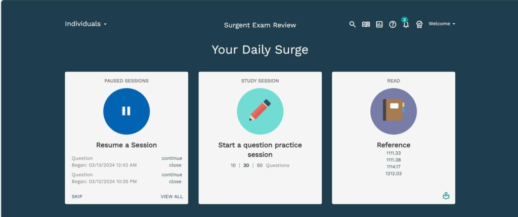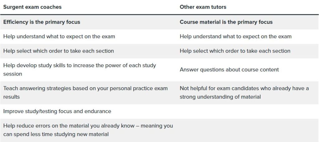 - Study Coaching: Though only available in Surgent’s Ultimate Pass, the 1:1 study strategy sessions were helpful in formulating a study plan and feeling more confident in the journey.