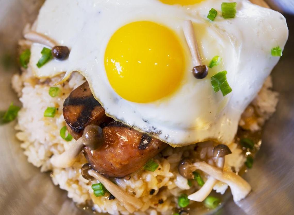 Reader, I ordered it, and I’m here to tell you that Spam gets a bad rap. In the context of the loco moco, at least, it was darned good – grill-marked, smoky, salty and doused with that black pepper gravy. A thick hamburger patty, peppery and a bit pink inside, lent heft; two sunny-side-up eggs added brightness; and the sweet-sour crunch of tiny pickled onions made a pleasing contrast.