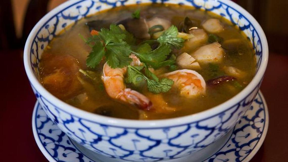 The secret: The fresh galangal root and lemongrass served in the soup, each bowl of which is made to order, Thai Palace co-owner Somsong “Sam” Abrahamian said. Accidentally biting into the galangal can help clear the fuzziest of heads.