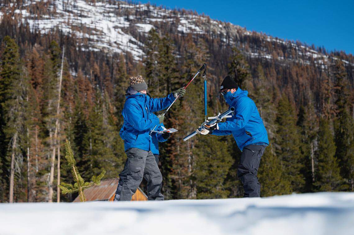 The state measures snow levels continuously through electronic sensors embedded in the soil throughout the Sierra. The monthly surveys at Phillips, a former cattle ranch and stagecoach stop, are a low-tech affair: Crews from the Department of Water Resources plunge a specialized hollow aluminum tube into the snow at multiple points along a 200-yard course and then calculate the depth of the snowpack by measuring what’s inside the tube.
