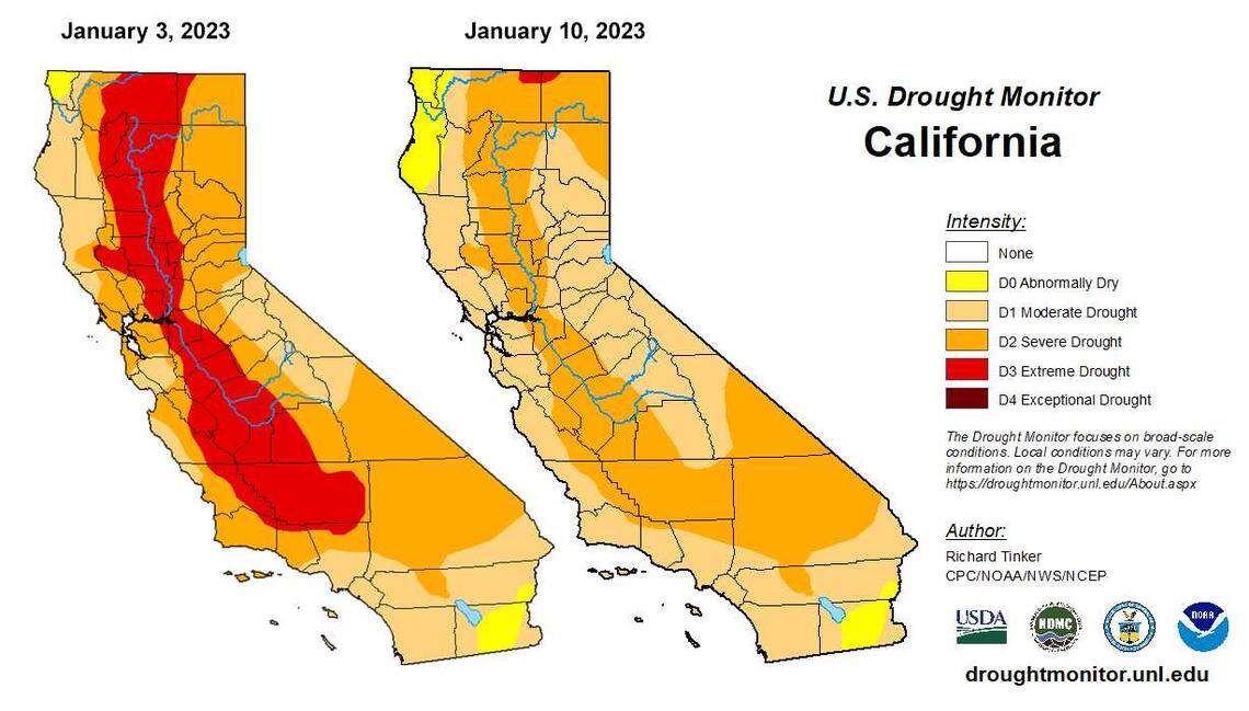 Less than half of 1% of California is now classified in either “extreme” or “exceptional” drought conditions, according to a weekly update Thursday from the U.S. Drought Monitor – down from 27% just one week earlier and from 41% at the start of the current water year on Oct. 1.
