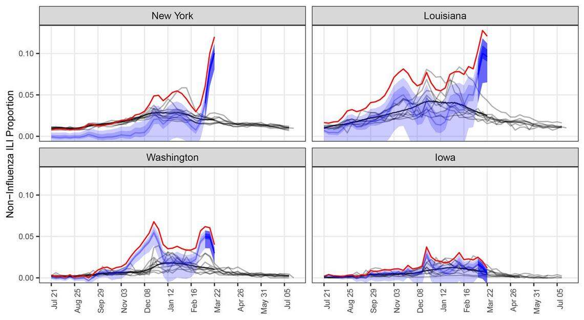 Many states such as Washington, New York, Oregon, Pennsylvania, Maryland, Colorado, New Jersey, and Louisiana “showed a surge in number of non-influenza ILI cases in excess of seasonal norms,” the study said.