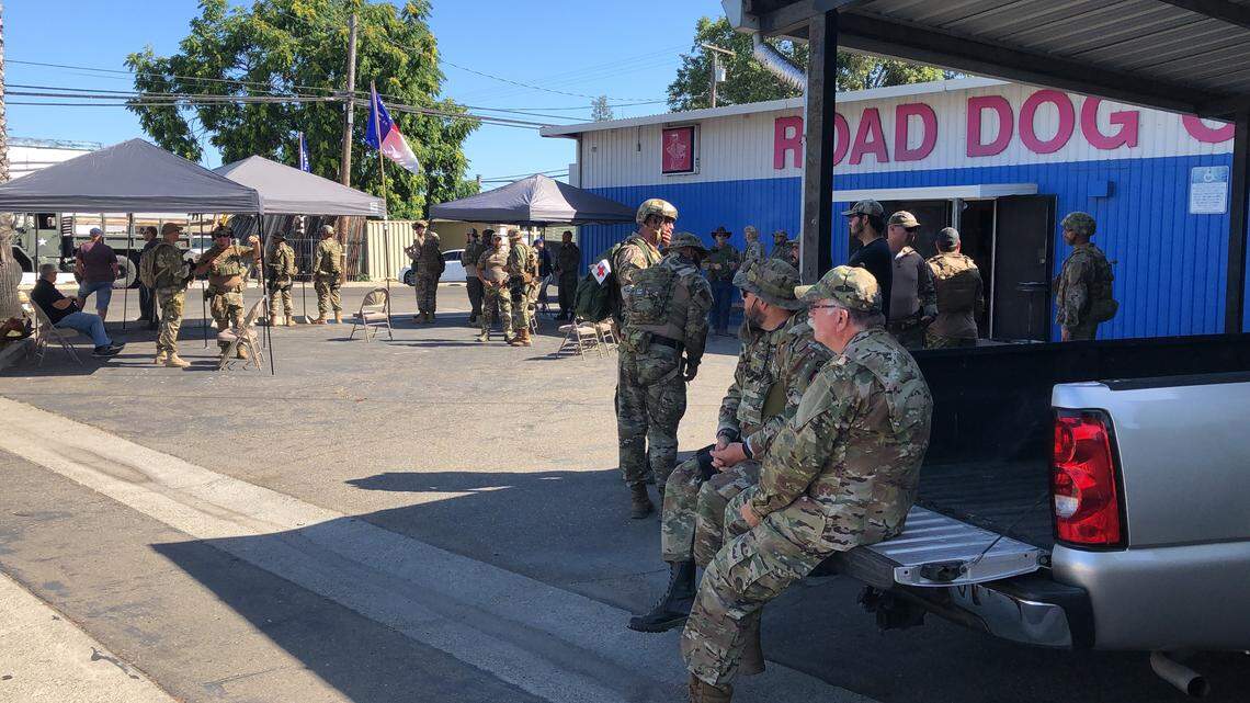 Brown said his company has 80 to 100 regulars at any given time. It appears about three dozen were at Road Dog on Saturday morning, and far fewer in Oakdale. The militia’s website says Echo Company protects “Northern California Citizens in the Sacramento area,” and Brown said membership extends south to Mariposa County.