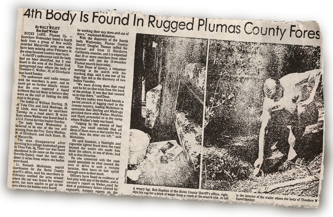 More than 100 days passed before the snow melted and search parties found four of the boys’ bodies in rugged Plumas National Forest, midway between Lake Tahoe and Mt. Lassen, about 75 miles northeast of Marysville. At least one had survived for weeks in a remote forest service trailer nearly 20 miles from his group’s car, eventually dying from exposure and starvation despite nearby food and fuel for a fire. Body parts of the others were found nearby.