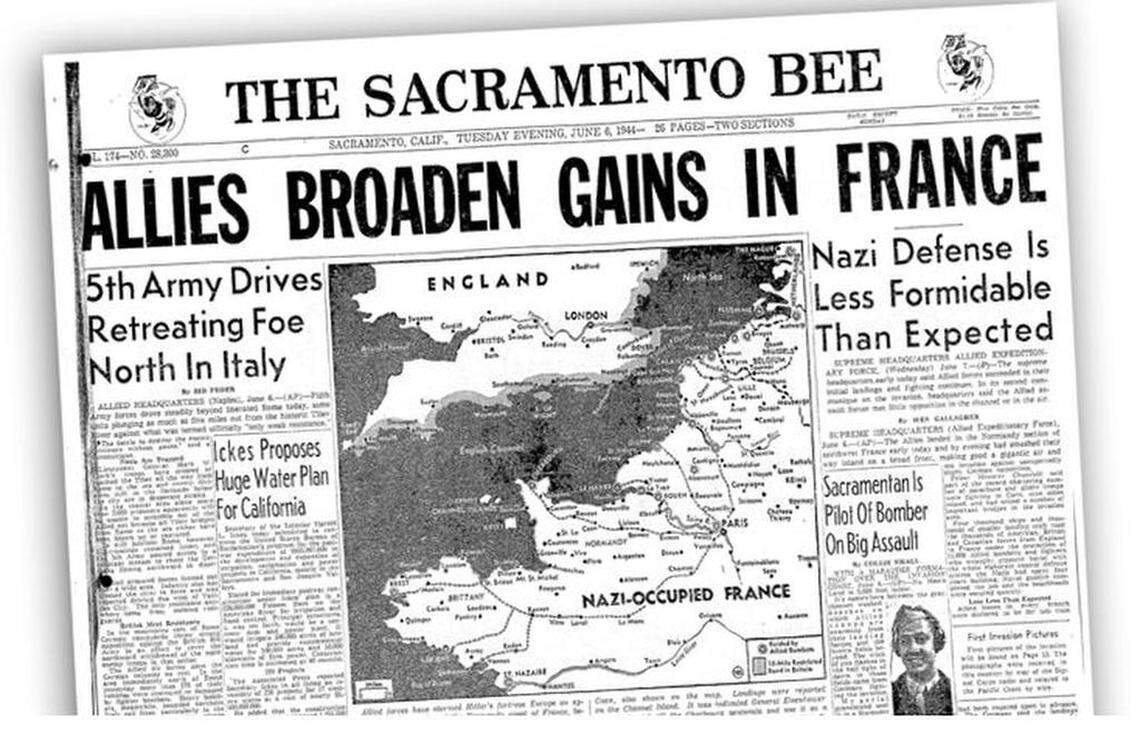 June 6, 1944: The United States and its allies stormed the Normandy beaches, overcoming entrenched Germany opposition and ultimately establishing a position from which to launch a final conquest of the European continent and end World War II. In that day’s Sacramento Bee, United Press’ Collie Small wrote a first-person account from an Allied aircraft, piloted by First Lt. Carl Oliver of Sacramento. Here’s excerpts from Small’s report: