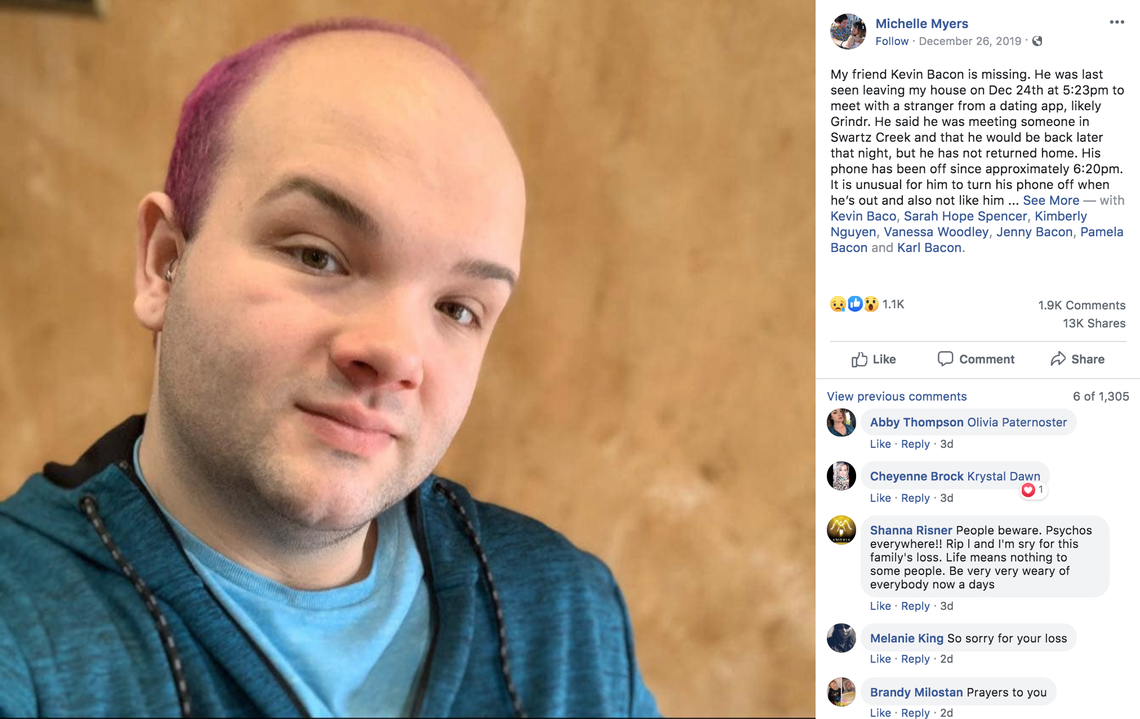 The day before, Bacon — a hairstylist — had told a friend he was meeting up with a man he’d met on the dating app Grindr, Michigan Live reported. Later that evening, Bacon texted his friend that he was having fun and would be out for a while, according to the outlet
