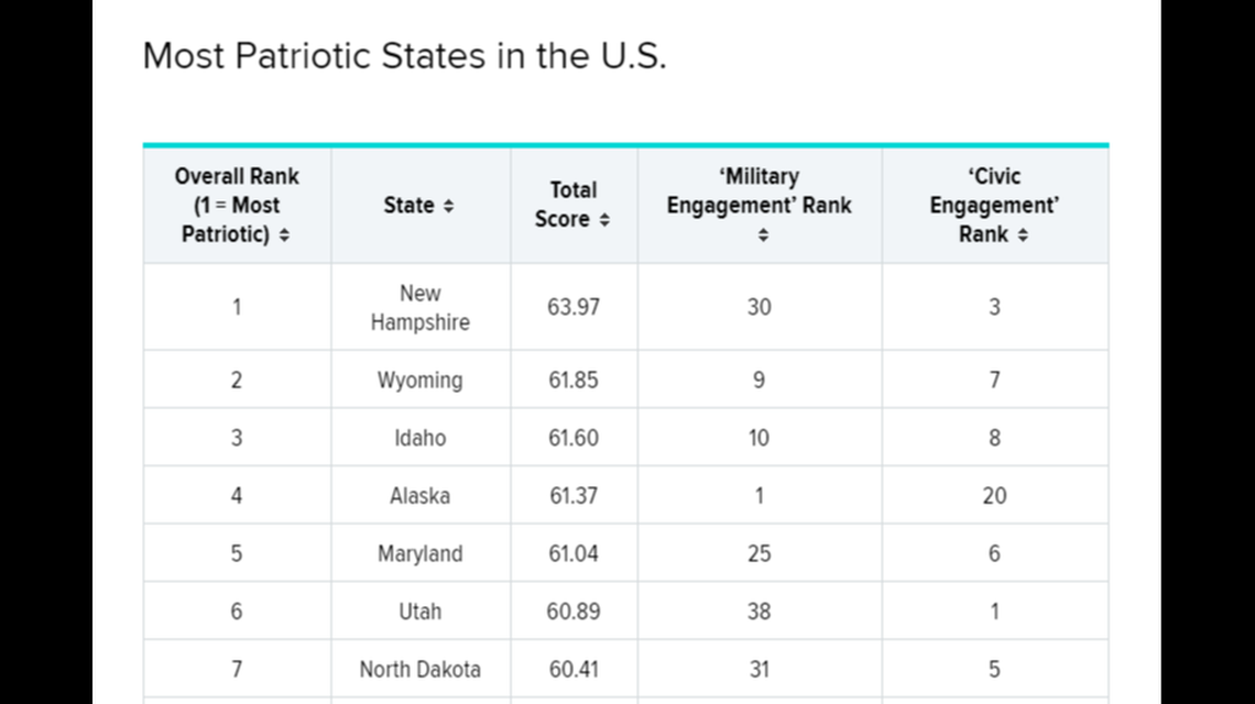 Using those criteria, WalletHub determined that the top 5 most patriotic states were New Hampshire (1), Wyoming (2), Idaho (3), Alaska (4) and Maryland (5). The 5 least patriotic states were West Virginia (46), Texas (47), California (48), New York (49) and New Jersey (50).