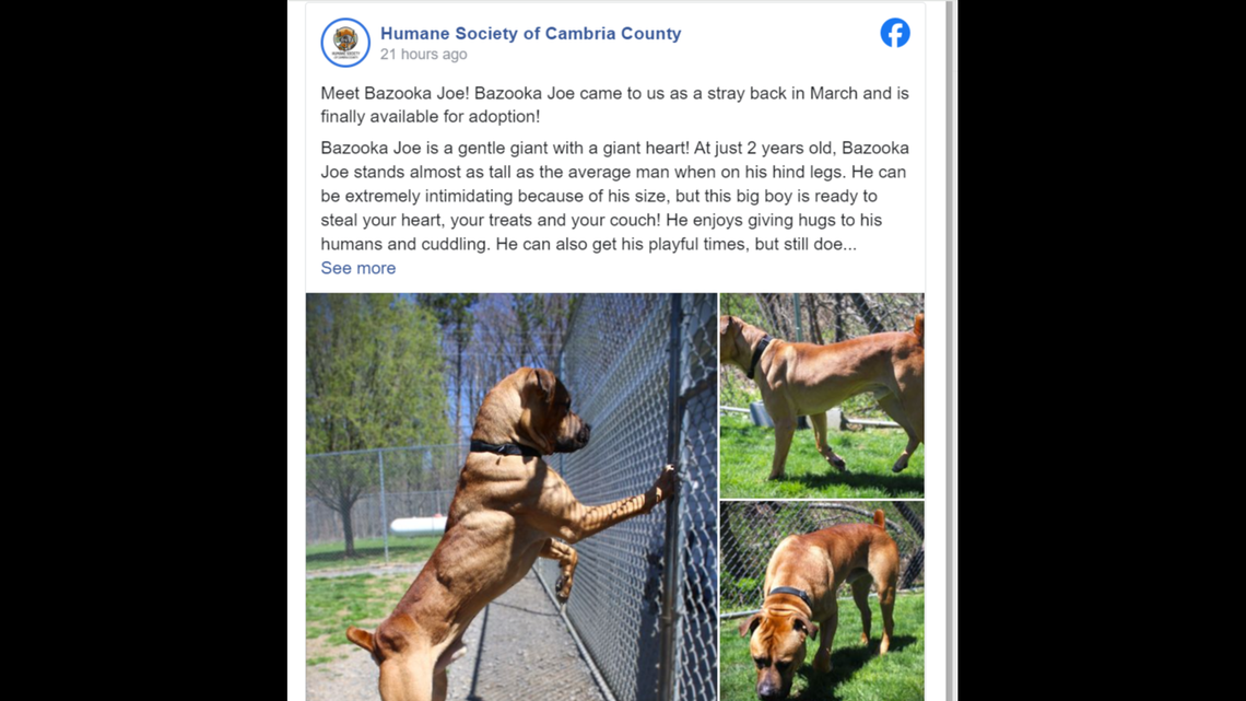 Meet Bazooka Joe, a beautiful pup that has been at the Humane Society of Cambria County since March, an April 22 Facebook post said. And he’s been nothing but a sweetheart with a ridiculously cool name.