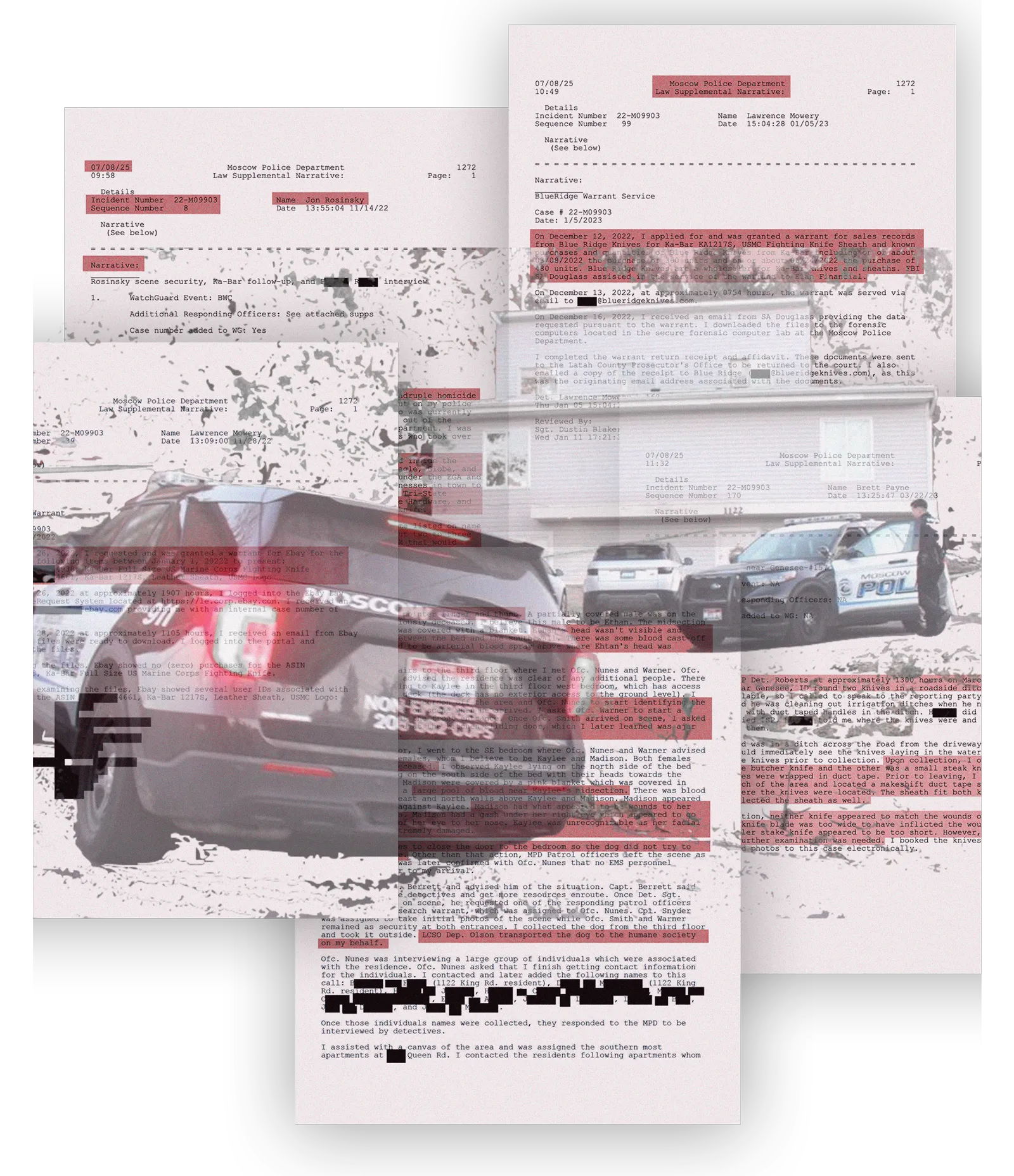 Hundreds of reports released by the Moscow Police Department — and reviewed by the Statesman — showed police quickly cordoned off the area and began tasking officers with varying assignments: The initial responder identified college-aged people gathered out front of the house; another officer logged the people entering the home; a corporal took initial photos; and a patrolman stood guard at the sliding glass door in the kitchen, which was found ajar.