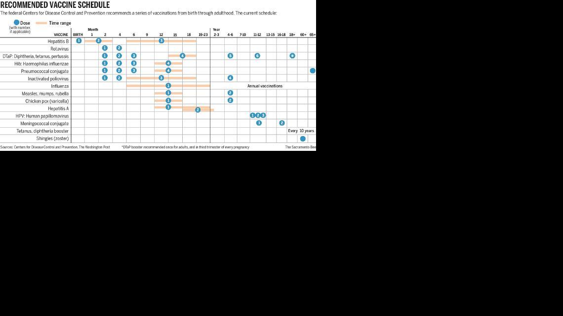 The federal Centers for Disease Control and Prevention recommends a series of vaccinations from birth through adulthood. The current schedule: