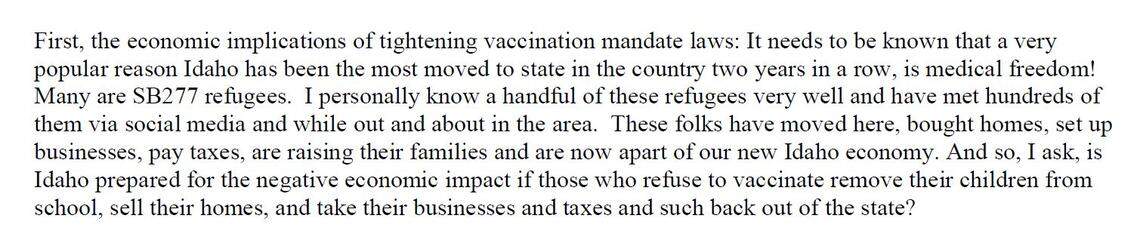Some Idaho newcomers told the Statesman they were hesitant to go public with their stance on vaccinations. One person said they prefer to stay “under the radar” with their views, “even amongst family.” At least one person used a pseudonym to testify.