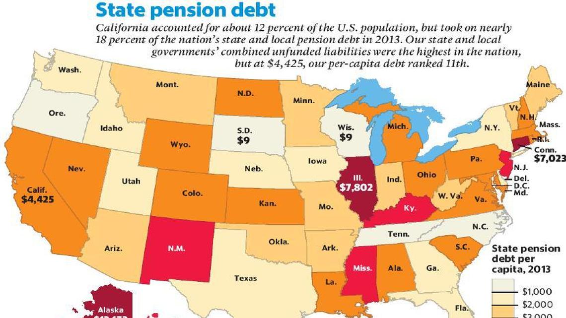 The per-capita obligation ranked 11th highest among U.S. states, according to a Sacramento Bee analysis of latest data by the U.S. Census Bureau. California’s total pension debt, $610.3 billion, is the largest in the nation.