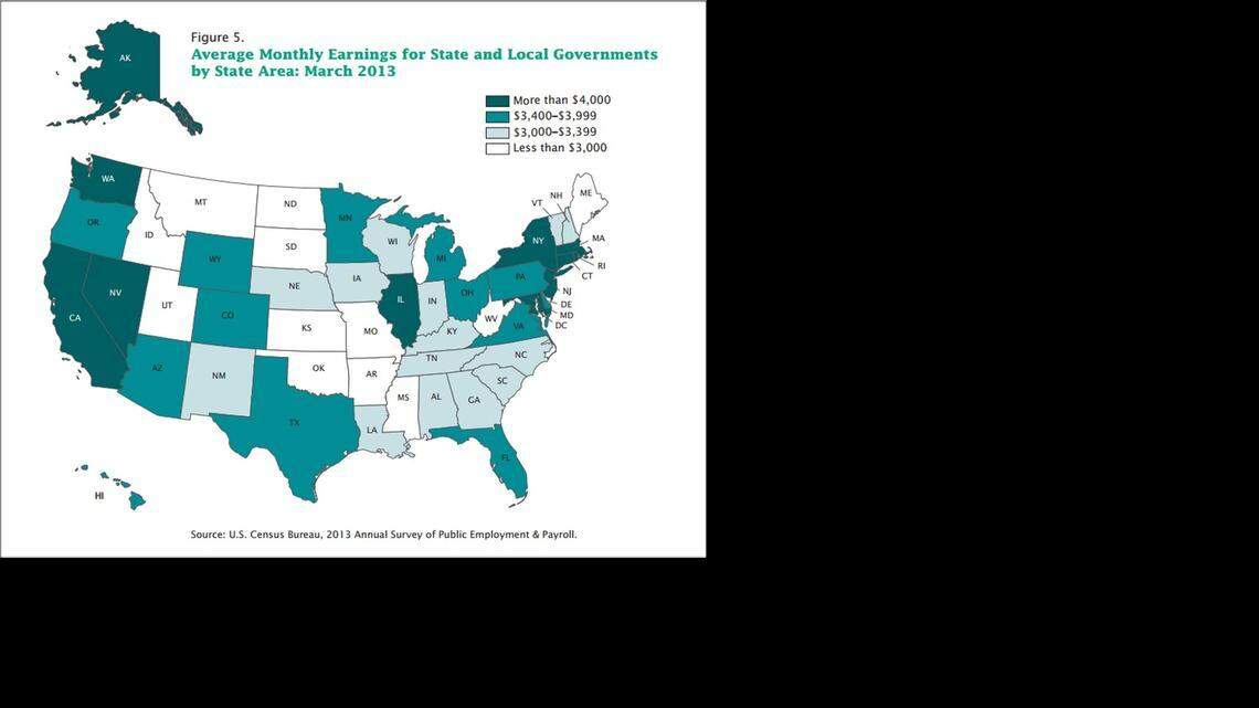 Full-time and part-time federal, state and local public employees earned an average $4,789 for the month of March 2013 when the bureau surveyed personnel numbers and pay. That ranked behind only New Jersey ($4,849 per month), New York ($4,888 per month) and well behind the federally-dominated District of Columbia ($6,069 per month).