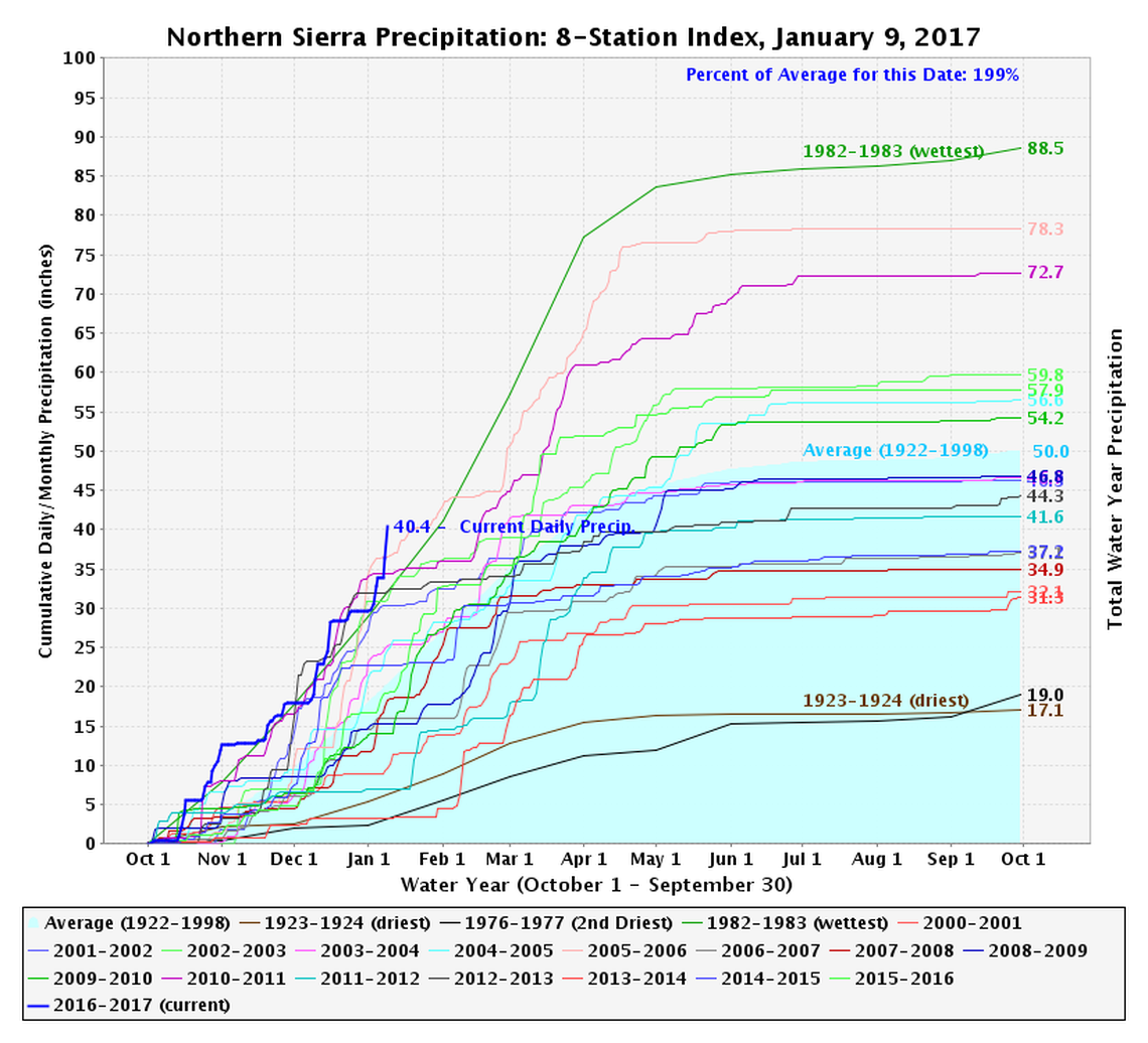 Noon: In a normal water year, the Northern Sierra mountain range gets about 20 inches of precipitation by early January. So far this water year, the Northern Sierra has topped 40 inches of precipitation.